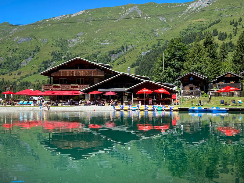 Hiver : Restaurant self, bar. Plat du jour et spécialités savoyardes. Sandwicherie, terrasse, solarium. Eté : Dans un cadre exceptionnel, terrasse en bordure de lac et face à la chaîne du Mont-Blanc. Restauration traditionnelle, bar, hôtel.