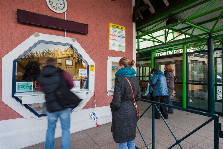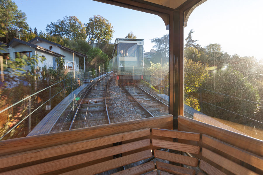 Le funiculaire relie depuis 1888 le centre-ville et la "ville basse" et le port de Thonon. Superbe vue sur le port de Rives et le lac Léman. Son originalité : le seul funiculaire au monde où les cabines se croisent en courbe !
