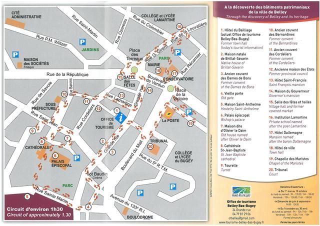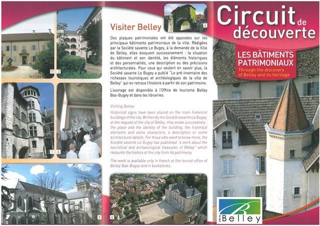 Hôtel du Bailliage - Maison Natale de Brillat - Savarin - Ancien couvent des Dames de Bon - Vieille porte - Maison Saint - Anthelme - Palais épiscopal - Maison dite d'Olivier le Daim - Cathédrale St -Jean - Baptiste - Tourelle - Ancien couvent des Bernardines - Ancien couvent des Cordeliers - Ancienne maison des Etats - Hôtel Saint - François - Maison du Gouverneur - Salle des fêtes et halles - Institution Lamartine - Hôtel Dallemagne - Hôtel deville - Chapelle des Maristes - Tribunal. Après un premier parcours inauguré en 2006, onze nouvelles plaques ont été réalisées : Ancien hôtel Pernollet (XIXe - XXe siècles), 9 place de la Victoire - Ancienne prison (XIXe siècle), rue Jules Ferry - Vestige du mur d’enceinte de Belley (XIV e siècle), 59 boulevard du Mail - Pierres à cupules, parc Jean-Pierre Camus - Maison Gabriel Taborin (XIXe siècle), 7 rue du chapitre - Le presbytère (XVIIIe siècle), 6 rue du chapitre - Ancienne maison du Doyen du chapitre (XVIe-XIXe siècles), rue du chapitre - Ancien bâtiment des bains publics (XXe siècle), 6 rue des Bains - Ancien couvent des Ursulines (XVIIe siècle), 33/37 rue Saint-Martin - Hôpital Récamier, rue Château Larron - Place des Terreaux, les halles de la salle des fêtes.