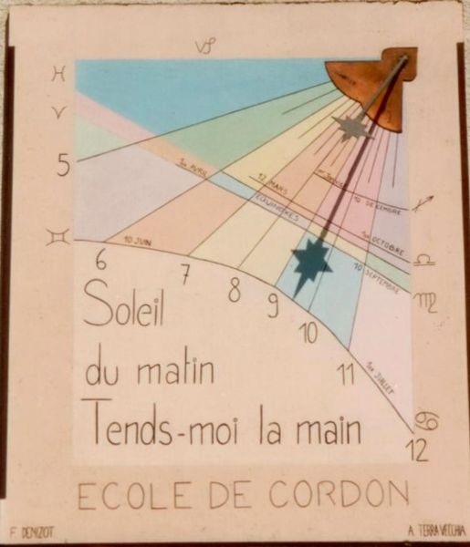 Deux cadrans solaires sont imaginés en 1993, par les élèves de l'école de Cordon et sont apposés aujourd'hui, un sur le mur est, l'autre sur le mur ouest. Le cadran solaire apposé sur le mur aval de l’école primaire de Cordon est déclinant du matin, peint sur panneau équatoriale, arcs des solstices et des trimestres. Daté de 1993 à 1994, la devise écrite est « soleil du matin tends moi la main » Il indique les heures de 5 à 12 ainsi que les demi-heures. Il porte 3 arcs des signes et les symboles du zodiaque. Une étoile dorée termine son style, issu de l’angle supérieur. Dans le bas, les noms des créateurs : F. Denizot, A. Terre-Vecchia et Y. Bottolier-Lemallaz. La latitude et la longitude y sont inscrites. Un 2ème cadran réalisé en 1993, se situe dans la cour de l’école primaire et sa réalisation est due à la même directrice d’école, Monique Gerola. Peint sur bois il domine la cour de récréation. Il est fortement déclinant le soir. Les astres peuplent le ciel nocturne en haut à droite. En bas, la plage bleue, notre planète porte des fleurs et un coq annonciateur du lever du jour. L’éventail horaire rayonne du centre du soleil. Il y a un arc pour la chandeleur et un pour le 1er mai. Son style polaire porte un cœur avec un œilleton. Il a été réalisé sur les conseils de F. Denizot, A. Terre-Vecchia Le premier est visible de la route. Le deuxième est dans la cour de l’école et non accessible dans le temps scolaire. Un cadran solaire est un instrument silencieux et immobile qui indique le temps solaire par le déplacement de l'ombre d'un objet de forme variable, le gnomon ou le style, sur une surface, la table du cadran, associé à un ensemble de graduations tracées sur cette surface. La table est généralement plane mais peut aussi être concave, convexe, sphérique, cylindrique, etc.