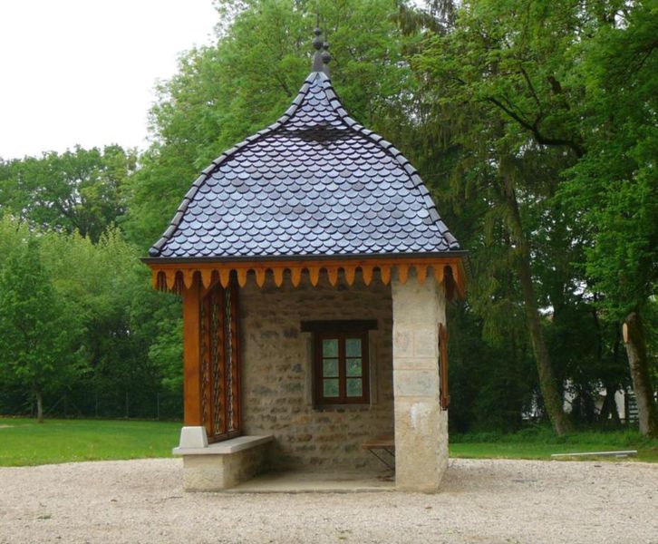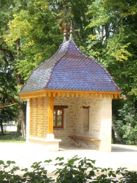 En traversant Meillonnas et en longeant le parc municipal, on peut découvrir en bord de route un petit bâtiment que l’on assimile à une gloriette, nom qui lui a longtemps été donné. Ce petit bâtiment, originellement situé à l’angle des routes de Viriat et de Treffort et gênant la circulation, a été déplacé à l’occasion de la création de la nouvelle route. Il est à rattacher à la maison visible au fond du parc, maison du XIXème de style colonial de l’île de la réunion. Le véritable nom de ce bâtiment dans son île d’origine est « Guétali » nom créole qui signifie « Regarde le ». Petit pavillon d’angle, il sert à regarder ce qui se passe dans la rue sans être vu.