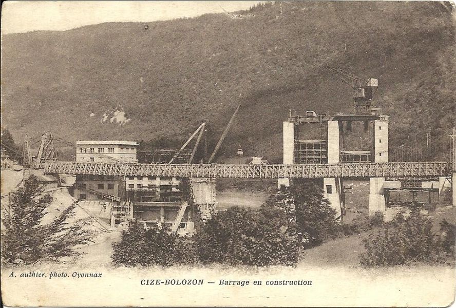 À l'époque de la construction du barrage de Cize-Bolozon, les sociétés d'électricité avaient chacune leurs usines, leurs lignes électriques et leurs clients. La centrale hydro-électrique de Cize-Bolozon construite sur l'Ain entre 1928 et 1931 par la société "l'Energie Electrique Rhône-Jura" était prévu pour améliorer l'alimentation des usines métallurgiques du Creusot et des houillères de Decize, le surplus étant revendu à la "Compagnie Bourguignonne de Transport d'Energie" qui fournissait Gueugnon, Bourges, Dijon, Lyon et voulait renforcer ses débouchés vers la région parisienne. Cette usine était la plus importante de la vallée de l'Ain. Actuellement sa production, comme celle de la plupart des autres usines de la vallée s'en va sur le réseau régional 63 000 V. La construction du barrage à travers une rivière aussi capricieuse qu'était l'Ain à l'époque n'a été rendue possible que par la confection d'enceintes circulaires en palplanches. Les crues nombreuses et exceptionnellement violentes du printemps et de l'été 1930 ont à plusieurs reprises noyé le chantier, mais la pugnacité des hommes a vaincu les déchaînements de la nature. Avec ses superstructures, le barrage est typique des constructions de cette époque. Sa disposition était rendue nécessaire par le type de vannes plates de 60 tonnes roulant sur des trains de chenilles, appelées vannes "Stoney". La grue imposante, aujourd'hui déclassée, est utilisée pour mettre en place les batardeaux de béton stockés près du pont et que l'on place les uns sur les autres pour former une espèce de barrage voûte devant les vannes que l'on veut réparer et qui peuvent ainsi être mise "hors d'eau". Cette grue a aussi quelquefois servi à transborder des marchandises ou de petits bateaux de part et d'autre du barrage, puisque l'Ain était navigable à l'époque