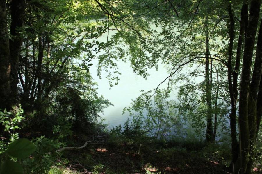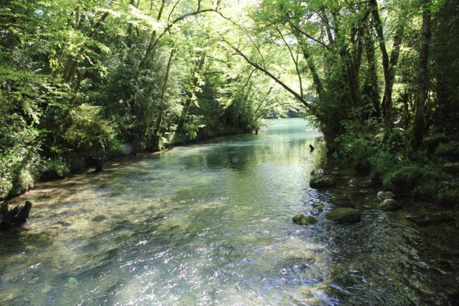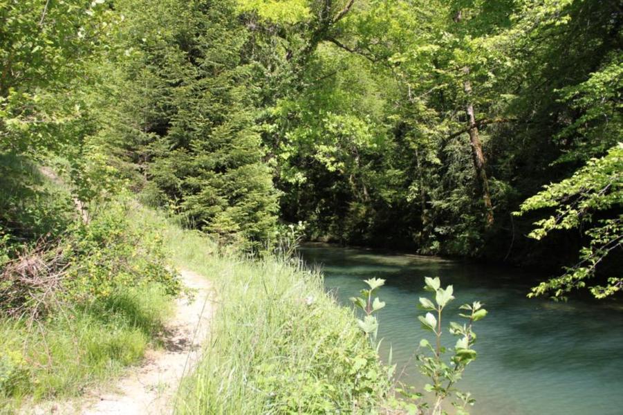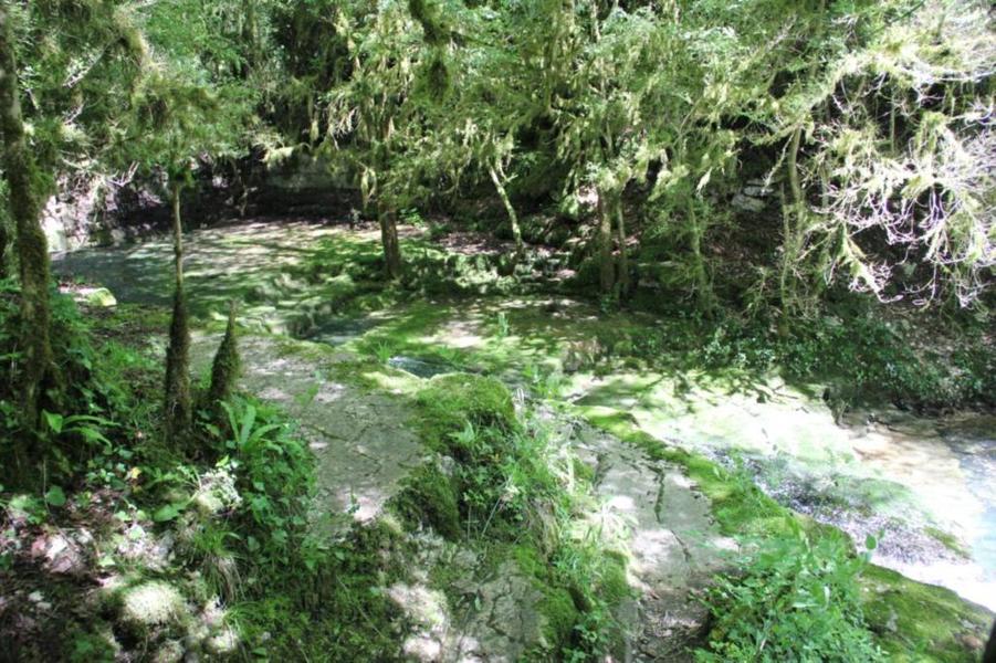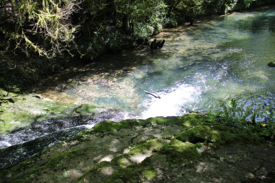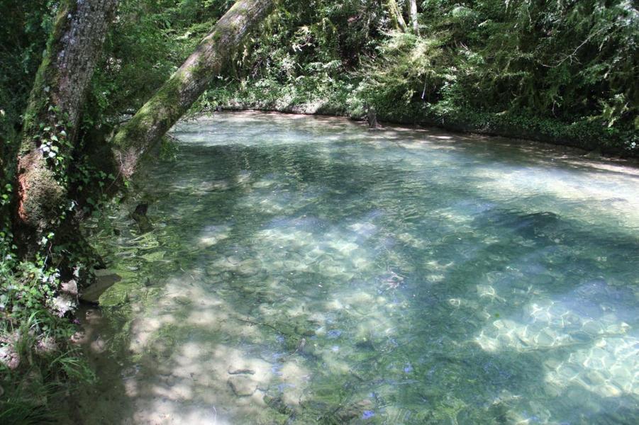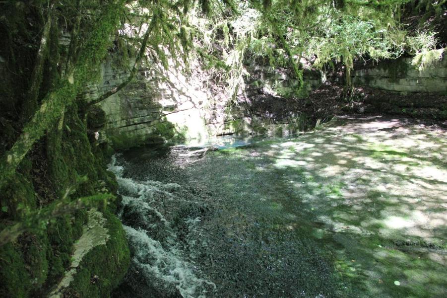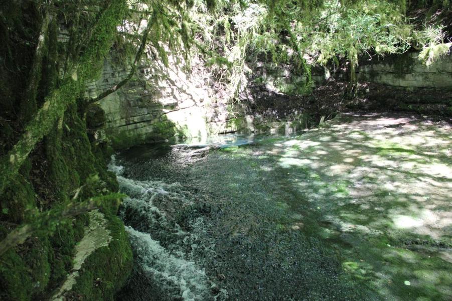 Depuis le viaduc, longez la rivière d'Ain et ses cabanes de pêcheurs. A côté d'une petite cabane en pierre à deux pas de l'eau, on découvre ce petit ruisseau qui sort de la roche pour rejoindre l'Ain. La "fontaine Noire" fait partie de l'ENS Haute vallée de l'Ain labellisé "ENS" par le Département de l'Ain en 2019. Véritables joyaux naturels et paysagers du Département de l'Ain, les sites bénéficiant du label ENS « Espaces naturels sensibles » sont gérés de manière à préserver la biodiversité qu’ils accueillent et aménagés pour l’ouverture au public (sauf exception due la fragilité des milieux). Spéléologie : Lors d'une prospection des rives de l'Ain en 1976 la cavité est découverte par les spéléologues. Robert Durand et Jean-Louis Fantoli explorent 402m de conduits noyés jusqu'à une laminoir étroit. Le 05/06/1977, une opération interclub (Daniel Andrès, O.Bigot, Jean-Louis Fantoli et Pierre Licheron) permet de trouver la suite dans le siphon et de déboucher dans une galerie exondée terminée par une trémie. La cavité se compose principalement de deux parties, caractérisées par l'existence d'une branche siphonnante à l'aval du trajet souterrain et d'une partie semi-active à l'amont. La vasque d'entrée plonge à -3 jusqu'au départ de la galerie. Après un point bas à -7, le couloir noyé (2,5 x 5m de section), au plancher et au plafond étonnement plans et lisses, remonte au bout d'une cinquantaine de mètres dans une salle d'effondrement, exondée en partie à l'étiage. De gros blocs et dalles de rocher entravent le passage et d'épais dépôts argileux tapissent à cet endroit le sol et les parois. En amont, le conduit s'immerge totalement et plonge à -10m. Tout au long du parcours, des stalagmites et stalactites attestent d'une phase exondée de la cavité, et demeurent une des curiosités maîtresse de la Fontaine. A 170m de l'entrée, un puits de 2m de diamètre est taillé à l'emporte-pièce au beau milieu de la galerie, qui se prolonge par un laminoir de 30m de long. Le puits donne accès à -20 à une galerie basse reliée également au laminoir par une cheminée de 8m. Des lames d'érosions hérissent le conduit jusqu'à la cote 280m, dans une salle à -18. Deux options se présentent : - au fond de la salle, en hauteur, un laminoir à -10m exhale un courant perceptible. - A l'ouest, une haute diaclase recoupant perpendiculairement l'axe de la salle, débouche à l'air libre en s'y refermant. A mi-hauteur, à -5, une galerie se prolonge sur une cinquantaine de mètres jusqu'à l'air libre, à 350m de l'entrée. La galerie exondée s'oriente vers le nord durant 284m. Les eaux de trop-plein de la circulation sous-jacente y circulent. Elle se développe sur un joint de strate (4 x 1,5m), recoupée par de nombreuses fractures perpendiculaires. Un redan de 6m précède un lac baignant en son extrémité une trémie impénétrable. Température de l'eau : 10°C.