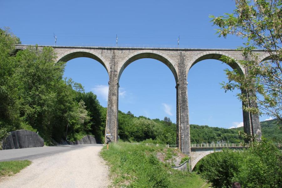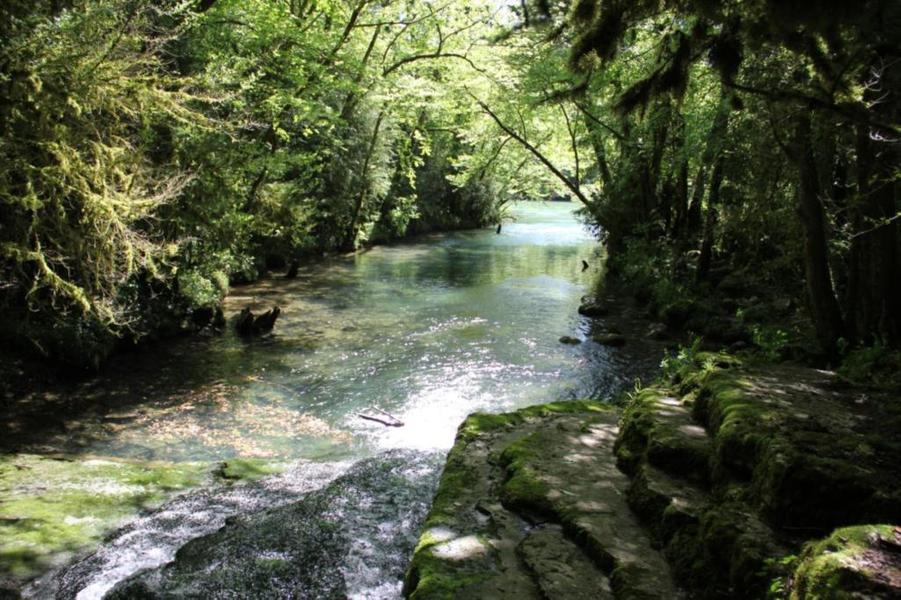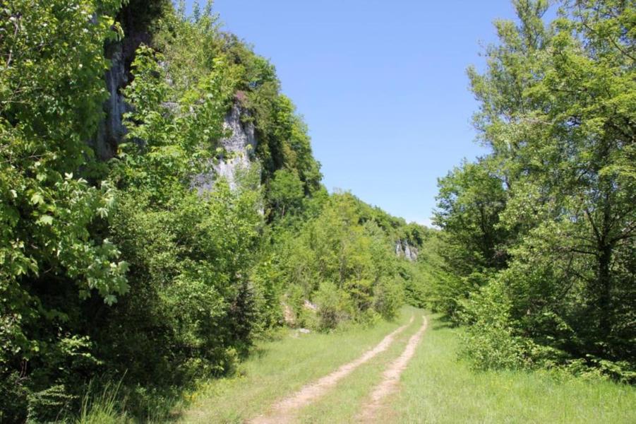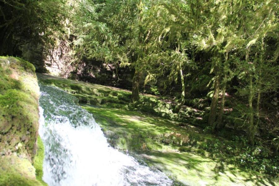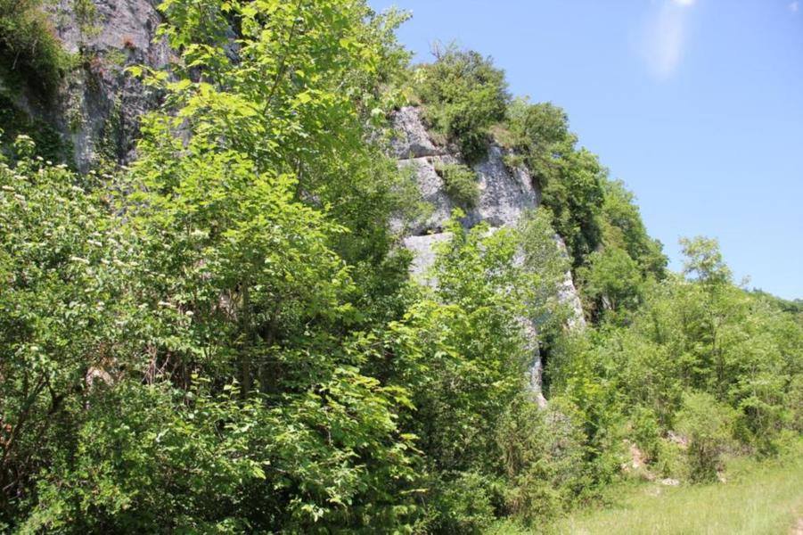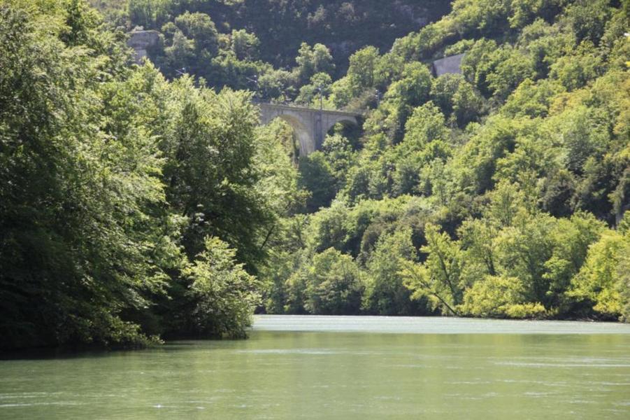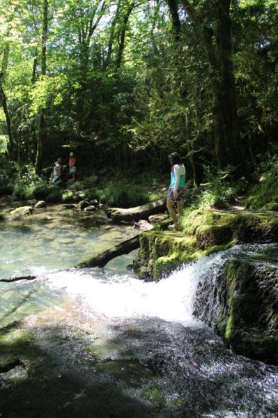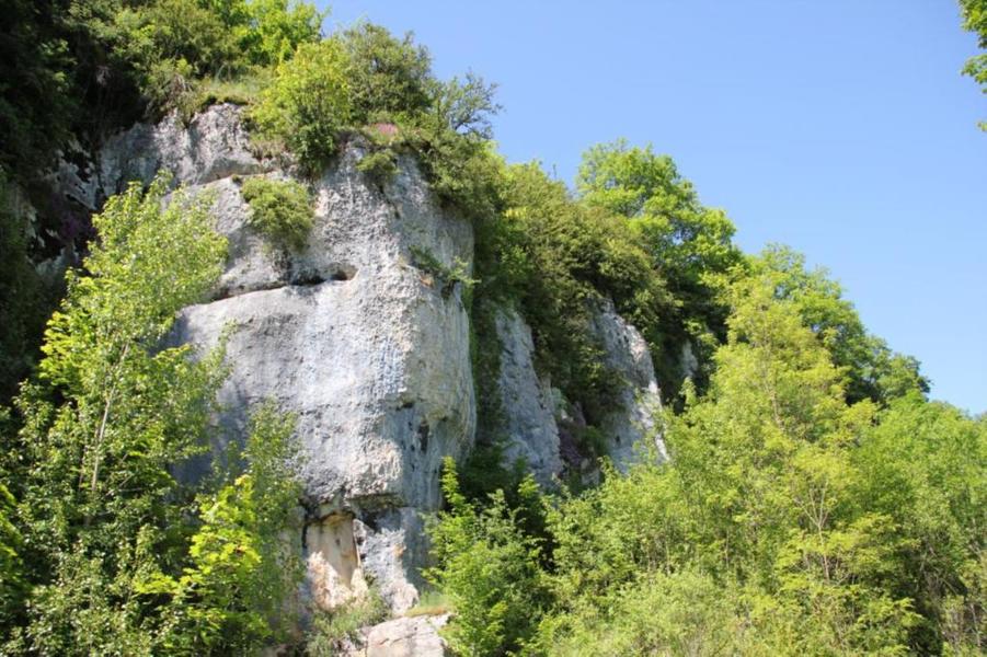 Depuis le viaduc, longez la rivière d'Ain et ses cabanes de pêcheurs. A côté d'une petite cabane en pierre à deux pas de l'eau, on découvre ce petit ruisseau qui sort de la roche pour rejoindre l'Ain. La "fontaine Noire" fait partie de l'ENS Haute vallée de l'Ain labellisé "ENS" par le Département de l'Ain en 2019. Véritables joyaux naturels et paysagers du Département de l'Ain, les sites bénéficiant du label ENS « Espaces naturels sensibles » sont gérés de manière à préserver la biodiversité qu’ils accueillent et aménagés pour l’ouverture au public (sauf exception due la fragilité des milieux). Spéléologie : Lors d'une prospection des rives de l'Ain en 1976 la cavité est découverte par les spéléologues. Robert Durand et Jean-Louis Fantoli explorent 402m de conduits noyés jusqu'à une laminoir étroit. Le 05/06/1977, une opération interclub (Daniel Andrès, O.Bigot, Jean-Louis Fantoli et Pierre Licheron) permet de trouver la suite dans le siphon et de déboucher dans une galerie exondée terminée par une trémie. La cavité se compose principalement de deux parties, caractérisées par l'existence d'une branche siphonnante à l'aval du trajet souterrain et d'une partie semi-active à l'amont. La vasque d'entrée plonge à -3 jusqu'au départ de la galerie. Après un point bas à -7, le couloir noyé (2,5 x 5m de section), au plancher et au plafond étonnement plans et lisses, remonte au bout d'une cinquantaine de mètres dans une salle d'effondrement, exondée en partie à l'étiage. De gros blocs et dalles de rocher entravent le passage et d'épais dépôts argileux tapissent à cet endroit le sol et les parois. En amont, le conduit s'immerge totalement et plonge à -10m. Tout au long du parcours, des stalagmites et stalactites attestent d'une phase exondée de la cavité, et demeurent une des curiosités maîtresse de la Fontaine. A 170m de l'entrée, un puits de 2m de diamètre est taillé à l'emporte-pièce au beau milieu de la galerie, qui se prolonge par un laminoir de 30m de long. Le puits donne accès à -20 à une galerie basse reliée également au laminoir par une cheminée de 8m. Des lames d'érosions hérissent le conduit jusqu'à la cote 280m, dans une salle à -18. Deux options se présentent : - au fond de la salle, en hauteur, un laminoir à -10m exhale un courant perceptible. - A l'ouest, une haute diaclase recoupant perpendiculairement l'axe de la salle, débouche à l'air libre en s'y refermant. A mi-hauteur, à -5, une galerie se prolonge sur une cinquantaine de mètres jusqu'à l'air libre, à 350m de l'entrée. La galerie exondée s'oriente vers le nord durant 284m. Les eaux de trop-plein de la circulation sous-jacente y circulent. Elle se développe sur un joint de strate (4 x 1,5m), recoupée par de nombreuses fractures perpendiculaires. Un redan de 6m précède un lac baignant en son extrémité une trémie impénétrable. Température de l'eau : 10°C.