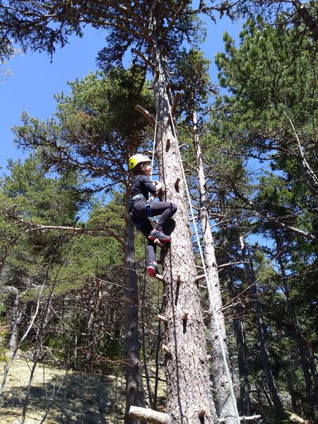 Cette activité est accessible à tous du débutant (enfants à partir de 5ans) au grimpeur confirmé. Vous apprendrez à confectionner le nœud d'encordement et à utiliser un outil d'assurage comme en escalade. Cette activité est possible toute l'année et presque quelque-soit la météo : vous pouvez éventuellement grimper avec des gants, les pins sylvestres offrent un abri relatif de la pluie et les branches sont peu glissantes même humides. Cette activité est même possible en nocturne muni d'une lampe frontale. Les arbres sont taillés pour rendre l'escalade sûr et agréable. Sur la plupart des arbres vous utiliserez uniquement les branches taillées à la longueur adéquate, l'escalade est ainsi 100% naturelle. Sur les arbres les plus faciles, vous utiliserez parfois aussi une ou deux prises ajoutées ou une corde d'aide. Vous évoluez en toute sécurité avec un casque et un baudrier que l'on vous prêtera et la corde sera passée sur un relais en haut de l'arbre. Nous apprendrons à connaître les animaux des arbres grâce à un jeu et des des énigmes. Des descentes en Tyrolienne et des ponts de singe peuvent compléter la demi-journée. Encadrement : L'encadrement est assuré par des brevets d'état d'escalade ou guides de haute montagne diplômes et habitués à cette activité. Souvent ceux là même qui ont préparé les arbres.