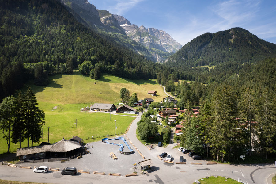 Couvert aménagé au Grand-Paradis à proximité du camping et du parking avec une cheminée, un espace cuisine, tables et toilettes.