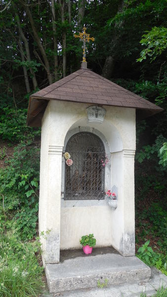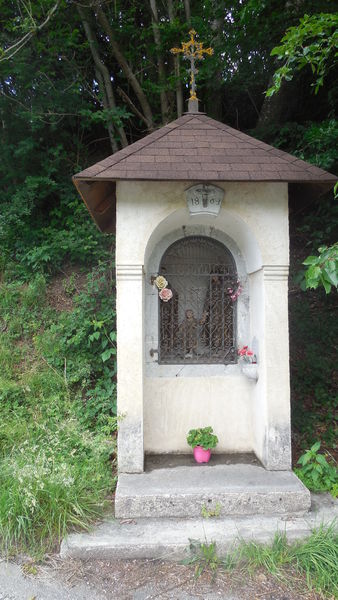 Statue de la Saint Famille en bois doré avec l’inscription «40 jours d’indulgence par Mgr Magnin à ceux qui réciteront un Pater, un Ave et un acte d’amour de Dieu 13-06-1863 – 17-06-1864» Petite Histoire En juin 1992, suite au travaux d’endiguement du torrent, l’oratoire à été démoli. Nouvel Oratoire (Reconstruit en 1994 en aval du précédent)