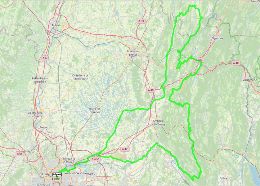 Boucle de 350km environ au départ de Lyon, à travers la Dombes, le Revermont, le Jura, et le Bugey. Prévoir la journée complète. Routes sinueuses, lac, charmants villages et points de vue jalonnent le parcours.