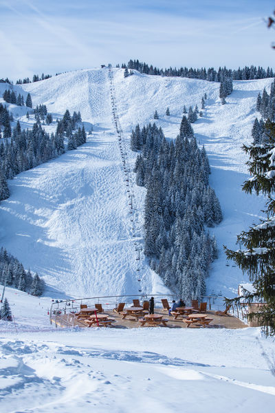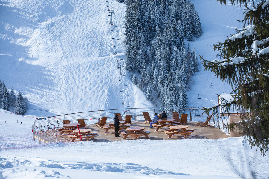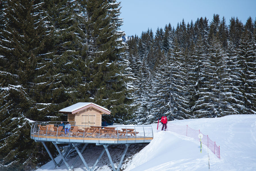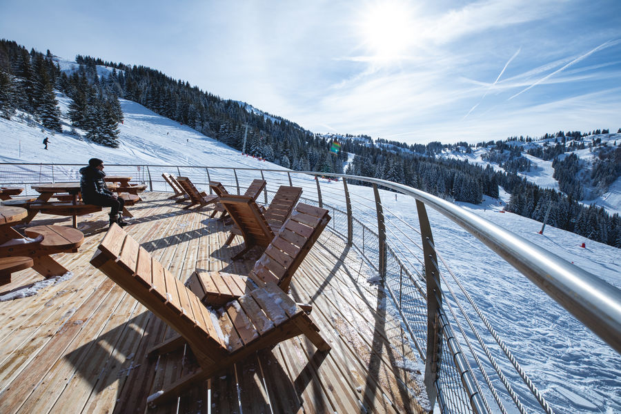 Plateforme de 117 m² bénéficiant d’un panorama agréable et d’une bonne exposition au soleil. Elle est équipée de 6 tables en bois 8 personnes avec banc intégrés, ainsi que 10 bains de soleil en mélèze.