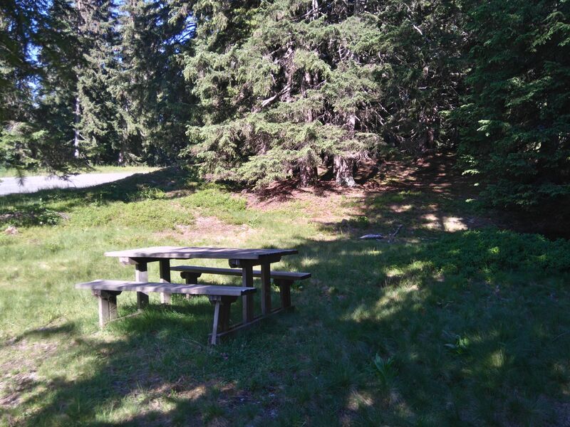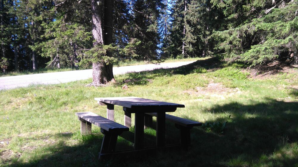 Aire de pique-nique équipée de 2 tables (de part et d'autre de la route) dans le secteur de la forêt (qui fait face au centre station). Ombre et fraîcheur garantie.