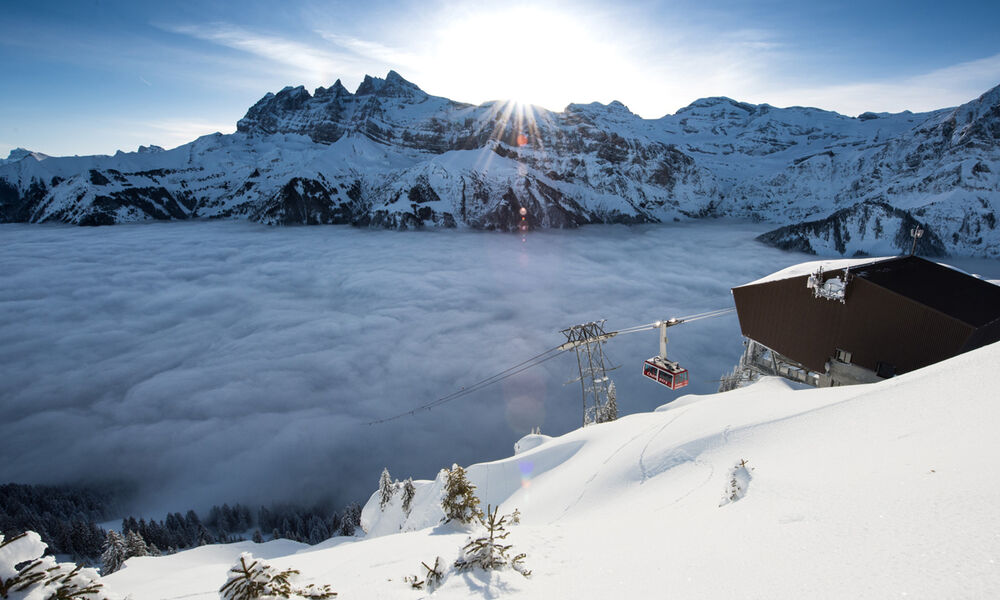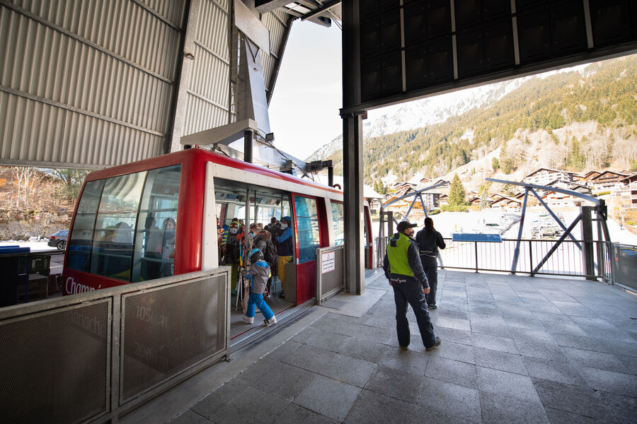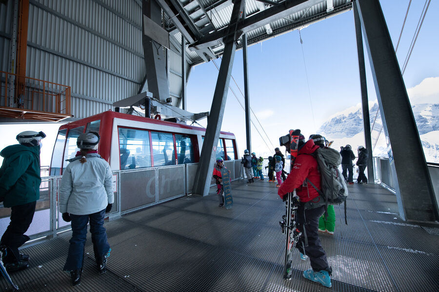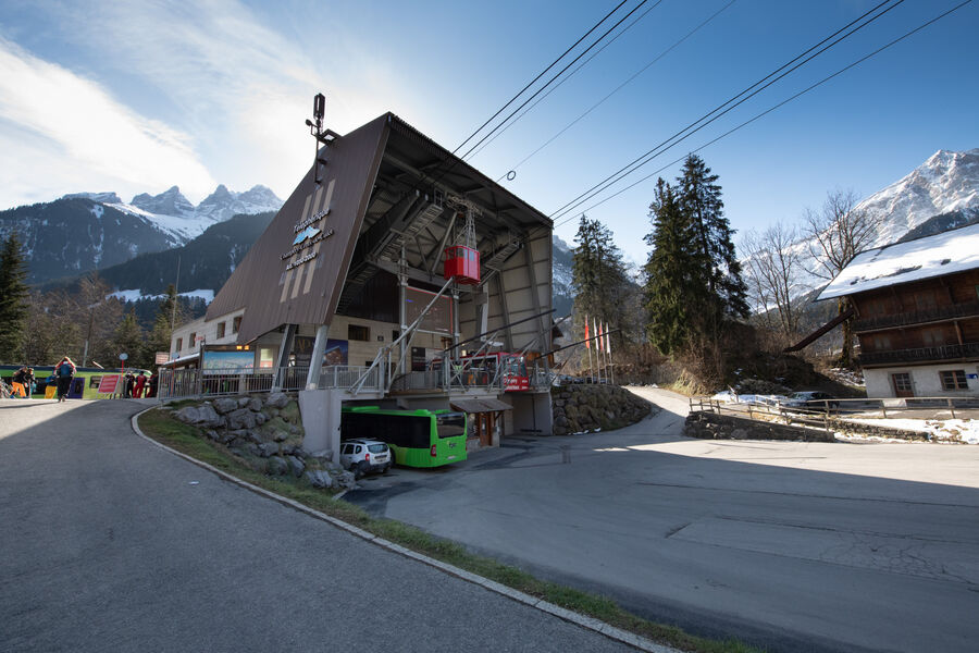 Téléphérique construit en 1987 avec une dénivellation de 899 m pour un trajet de 5 minutes seulement, situé à l'arrivée de la ligne AOMC à Champéry.