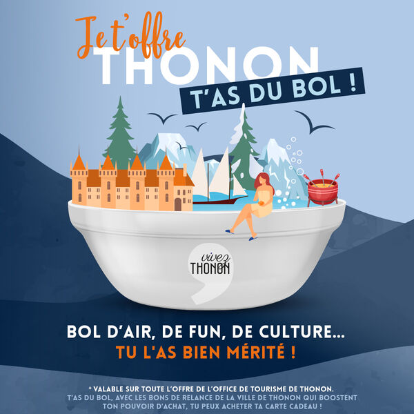 Offrez tout Thonon avec cette carte cadeau valable sur l'intégralité de l'offre de l'Office de Tourisme: séjours tout compris, activités, sorties culturelles, billetteries et spectacles, produits du terroir, souvenirs... T'as du Bol avec Thonon Tourisme !