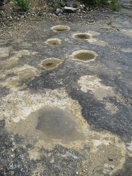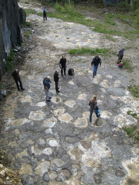 Ces dizaines d'empreintes sont datées de 150 millions d’années. Elles correspondent au déplacement de sauropodes, des diplodocus ou des brontosaures, c'est-à-dire de grands herbivores d’une vingtaine de tonnes. Le poids des animaux a laissé des marques notables dans la boue, comme des bourrelets de 35-40 centimètres de diamètre. Parfois, on distingue même les doigts ! Ces dinosaures étaient plantigrades à l’arrière et digitigrades à l’avant. Deux pistes parallèles remontent ainsi la plateforme sur une quarantaine de mètres. Cheminant à la recherche de nourriture, ils devaient être cinq ou six, ou peut-être davantage. Les pas laissés par ces géants nous font comprendre que la région n'était pas entièrement sous l'eau, comme on l'a longtemps cru. On comprend qu'il y avait des hauts fonds ainsi que des terres émergées ; des îles suffisamment grandes pour nourrir des troupeaux entiers. Mais comment ces traces nous sont-elles parvenues ? Des sédiments les ont recouvertes et enfoncées très profondément ; puis la tectonique des plaques a bousculé les couches, qui se sont plissées, fracturées et sont remontées à la surface. L'érosion des glaciers les ont ensuite dégagées.