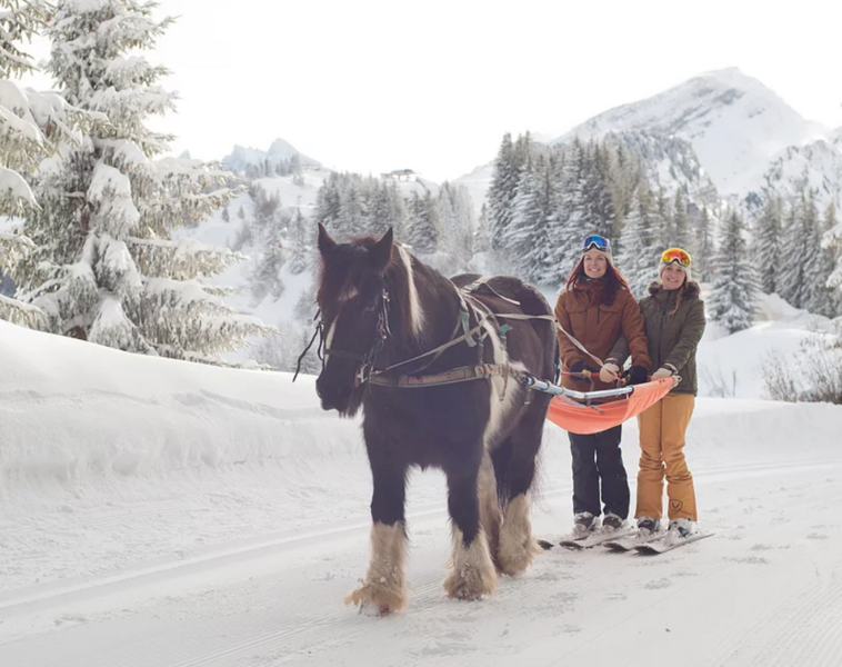 Le Ski-Jöering, plaisir de la glisse autrement. Venez profiter d'une expérience inoubliable à skis derrière un cheval, dans la majesté des décors des Portes du Soleil. Plusieurs séances sont possibles, initiation 30min, balade 1h ou confirmé 1h.