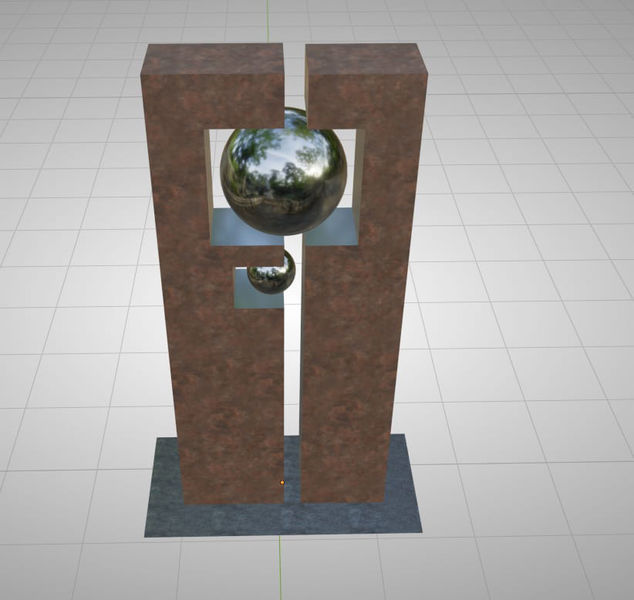 Située dans le parc de la Maison Biollay à Chedde, l'œuvre est composée de deux blocs de métal qui soutiennent en leur centre une sphère en inox poli miroir. Celle-ci reflète le paysage alentour, la crête du Mont Blanc, imprégnée de ce bleu et blanc si particuliers à la montagne, ainsi que le rose caractéristique des couchers su soleil sur les neiges éternelles. Sa brillance et sa pureté contrastent avec le métal bruit des deux segments qui la soutiennent. Leur aspect rouillé rappelle les forces mécaniques du travail industriel des hommes et des femmes actifs dans la vallée. La boule en acier inoxydable ainsi suspendue entre les interstices du métal met en exergue la nature alentour par opposition aux segments bruts géométriques, symbolisant l'industrie florissante de la région.