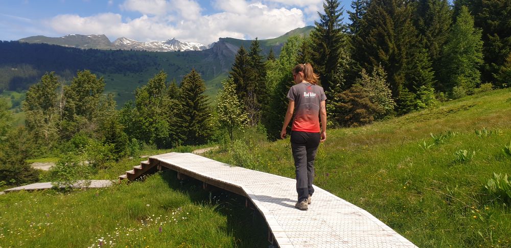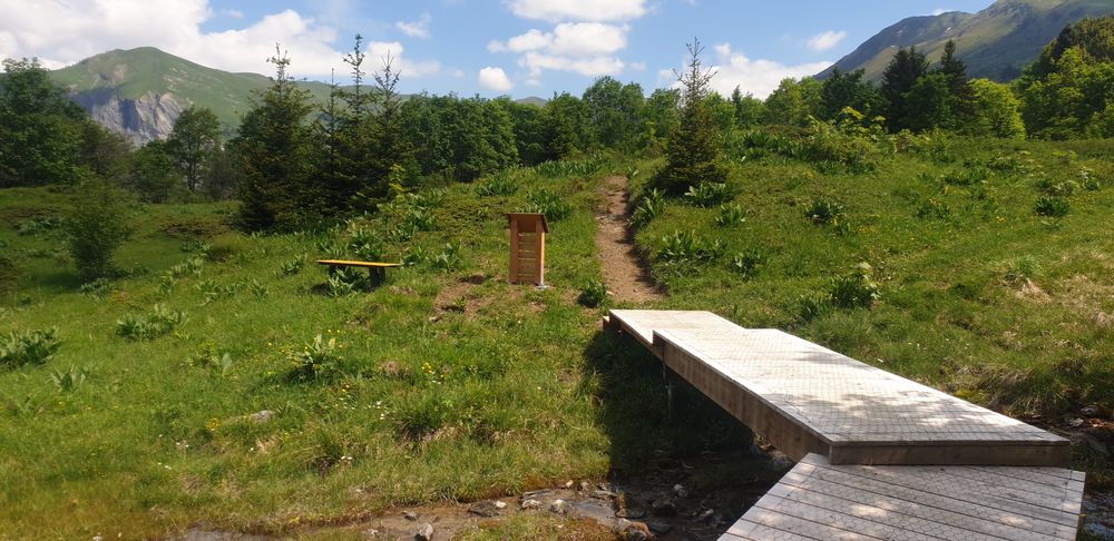 Au départ du Tovet, suivez la trace qui part du Totem d’entrée du sentier d’interprétation des Zones Humides. Celui-ci est indiqué tout le long de votre balade par Lulu la Libellule, mascotte de cet itinéraire. Après une première montée vous rejoignez la piste carrossable et poursuivez à gauche en direction du point d’observation des marmottes et de la table de présentation des zones humides. Juste avant de rentrer dans un sous-bois, un sentier en aller-retour sur votre droite vous permet d’accéder à une présentation des lézards dans les ruines d’un ancien chalet d’alpage. Le prochain arrêt présente le Sabot de Vénus, fleur emblématique de notre région, visible un peu à l’écart du sentier. Poursuivez votre ascension pour rejoindre, juste avant le chalet des Terreaux, un petit sentier qui vous fera alterner entre alpages et forêt. Vous passerez des fourmilières, pourrez écouter le bruit de la nature et traverserez la mare, une belle zone humide avec présentation des amphibiens. Continuer sur le sentier. Par un petit chemin escarpé en forêt vous atteindrez la dernière zone humide et la traverserez en marchant sur un platelage de 800 m de long pour ensuite rejoindre le sentier permettant de retourner à votre point de départ.