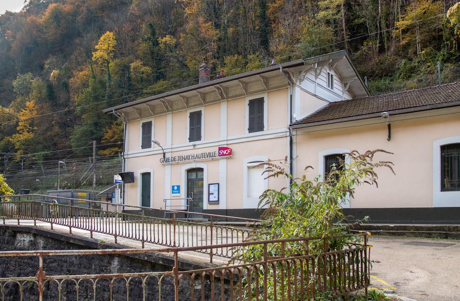 Gare SNCF de Tenay-Hauteville, dans la vallée de l'Albarine, desservie par les trains TER entre Lyon et Genève, et direction Chambéry. Services parking : voiture (gratuit). Distributeur automatique de billets TER.