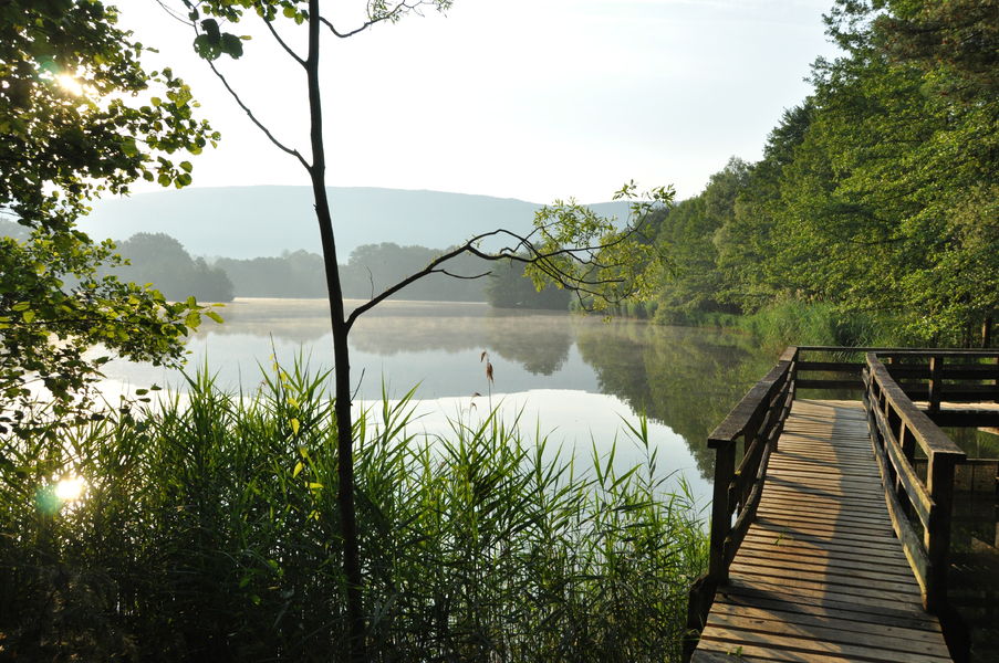 Un étang dans un écrin de verdure non loin des montagnes du Revermont, la Grange du Pin est un espace de détente et de loisirs. Profitez des lieux pour une balade autour du plan d'eau entre sous bois, pontons, passerelle flottante et la plage.