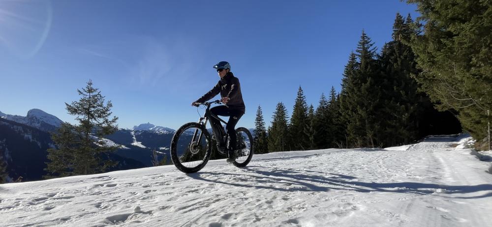 Initiez-vous gratuitement au VTT électrique sur neige ! Au coucher du soleil, apprenez à maîtriser votre vélo sur un plateau enneigé.