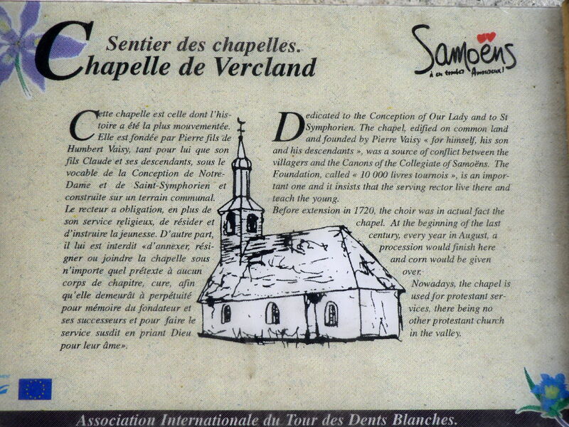 La chapelle du hameau de Vercland à Samoëns a été fondée en 1626 sur un terrain communal, par un particulier, Pierre Vaisy : « tant pour lui que son fils Claude et ses descendants… ». Elle est dédiée à la Conception de Notre-Dame et à Saint-Symphorien. Le hameau de Vercland, creuset historique des tailleurs de pierres de Haute-Savoie et aussi le berceau des premières remontées mécaniques. Ce hameau a connu une histoire mouvementée, sa chapelle également. En effet, l’édifice religieux a été source de conflits et de procès entre les habitants du village et les chanoines de la collégiale à Samoëns. Le coût de la fondation de la chapelle (10 000 livres tournois) est important et exige du recteur desservant, l’obligation de résider sur place et d’enseigner à la jeunesse. Autrefois en forme d’oratoire limité au chœur actuel, cette chapelle a été agrandie en 1721. Au début du siècle, encore, elle était le but d’une procession au mois d’août où l’on donnait du blé, elle se déroulait dans les jours précédant l'Ascension. Aujourd’hui, cette chapelle sert aussi au culte réformé. Culte qui n’a pas de temple dans la vallée du Haut-Giffre. L’association « Les amis des chapelles », association loi 1901, mène diverses activités pour rassembler des fonds. Cela afin d’aider la collectivité à entretenir et rénover ces édifices appartenant au patrimoine historique, culturel et religieux de Haute-Savoie. Ils organisent également des visites du monument en hiver et été. Pour découvrir le hameau savoyard, sa chapelle et ses environs, ainsi que les autres hameaux de la commune de Samoëns, des circuits partiels balisés (fléchage jaune) ont été réalisés.