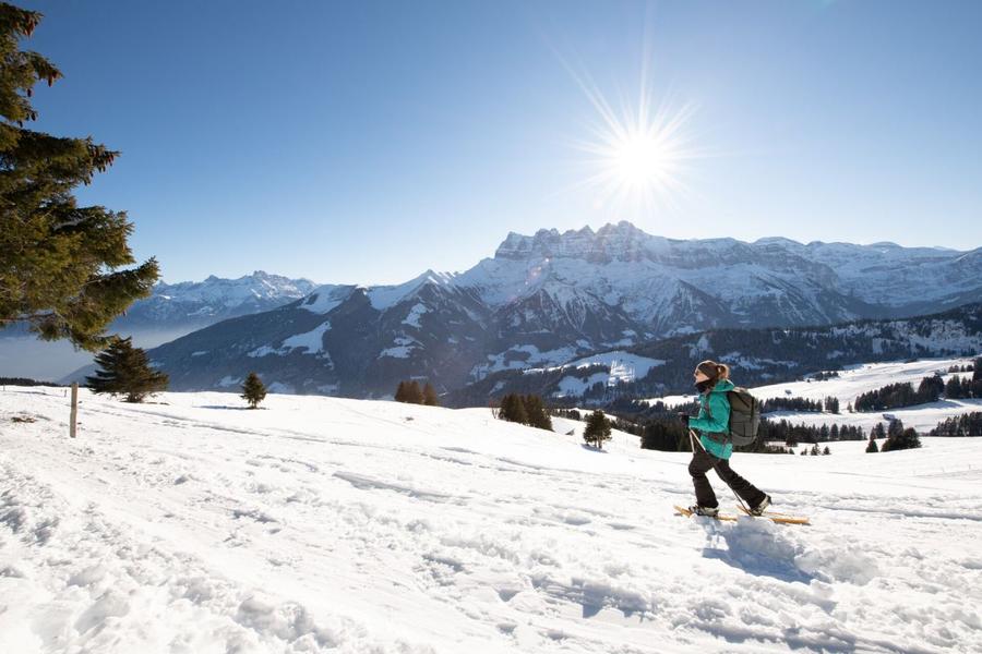 Prenez la télécabine de Morgins pour monter au sommet de La Foilleuse, profitez de la magnifique vue sur les Dents du Midi puis redescendez en raquettes via Savolaire jusqu'à Morgins.
