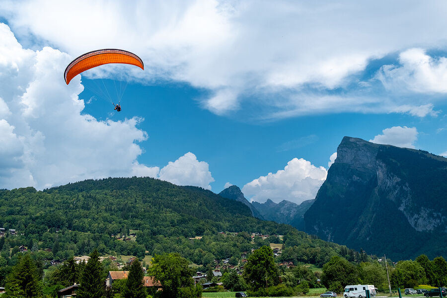 Orientation Sud à Sud Ouest Accès : Juste après la sortie de Samoëns direction de Sixt, prendre à gauche la route des Vallons d'en Haut . A la fontaine de Vallon d'en Haut, une route part à gauche et se transforme en piste, il faut garer la voiture et se mettre à marcher. Décollage : Le sommet ne présente aucune difficulté de décollage, si ce n'est les herbes qui peuvent être hautes en été et une pente raide. Si le vent est trop fort, n'hésitez pas à descendre au niveau du décollage des ruines cote (1850 m) Aérologie : Secteur assez bien protégé du vent météo. Attention aux orages. Atterrissage : Zone d'atterrissage de la piscine. Décollage parapente Samoëns. Description supplémentaire : Aouille de Criou, 2.207 m. Pointe de Ressacha, 2.220 m. Criou, plus qu'un sommet, c'est un immense plan incliné vers le Sud-ouest, bordé au Nord, à l'Est et à l'ouest d'imposantes falaises. Il offre aux randonneurs la récompense de deux vols faciles et très agréables après une rude montée. Massif : Haut giffre Accès routier : Samoëns. Direction Sixt puis Vallon d'en Haut. Navette voiture : Aucune pour criou 4 km pour Ressacha . Remarque : - Dans les 2 cas par bonnes conditions, il est possible de venir se poser entre les tennis et la nationale (terrain balisé) après avoir survolé Samoëns (cotation D, finesse 2,5 depuis Criou, 3,7 depuis Ressacha). - Il est vivement déconseillé de monter à Ressacha après le 30 Juin étant donné l'abondance et la hauteur de la végétation rendant la montée et la course d'envoi pénibles. Période idéale : hiver à ski ou fin de printemps à pied lorsque le sommet est encore enneigé.