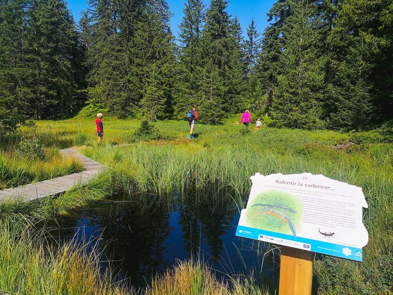 Au cœur de la réserve naturelle située sur le plateau du Lachat, ce sentier vous fera découvrir les particularités de la tourbière dans une ambiance rappelant les paysages scandinaves. Facile (3,6 km, plusieurs parcours possibles, de 1h30 à 4h).