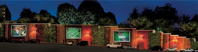 Sur 800 m² et 120 m de long, cette peinture murale avec végétation verticale et mise en lumière représente 3 photos de Yann Arthus Bertrand sur le thème de la sauvegarde de la planète, photos de pays où les soeurs de Saint Charles ont mené des missions.