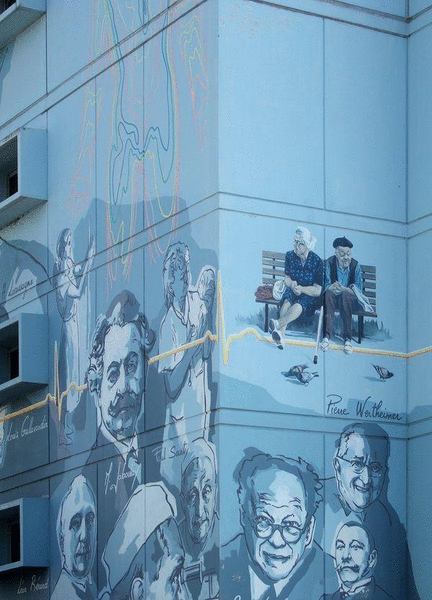 Mur peint sur 2 bâtiments de 500 m², sur le thème "Lyon, la santé, la vie" dans une dominante de bleu, il représente 30 personnages célèbres dans le monde de la médecine à Lyon.