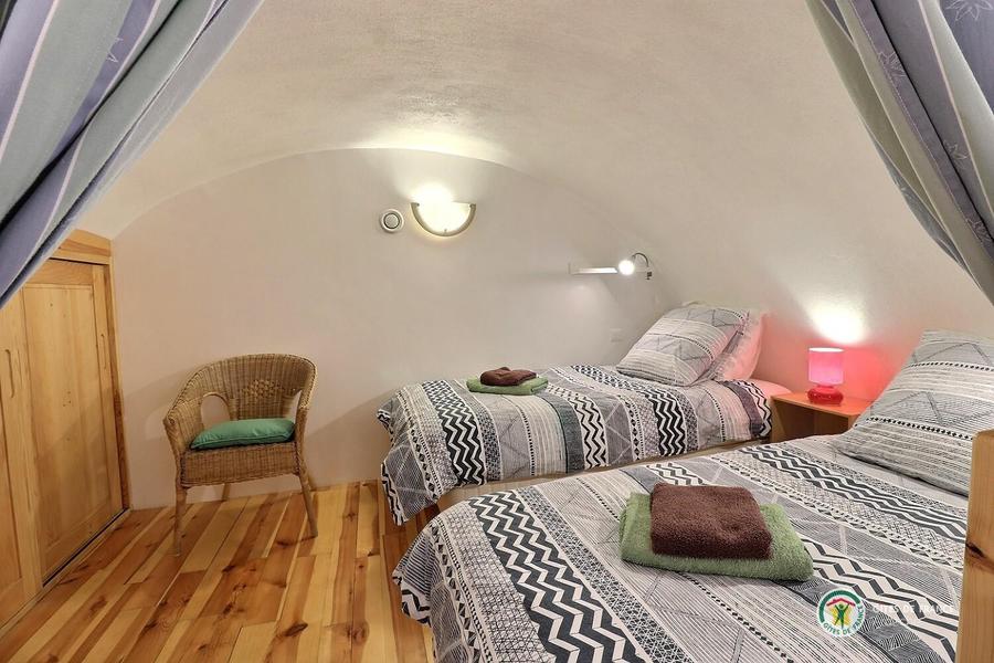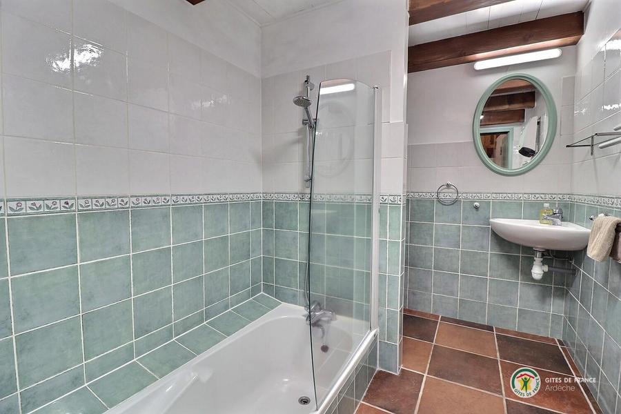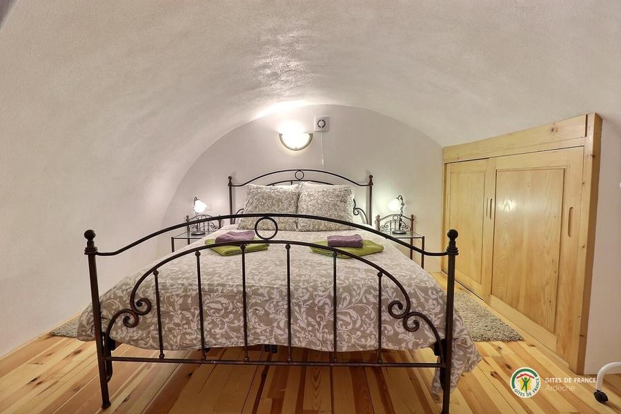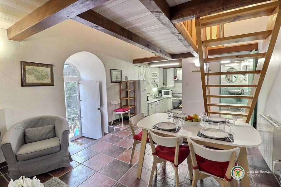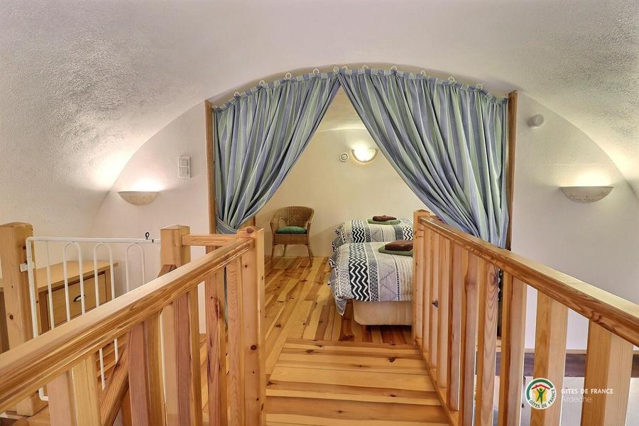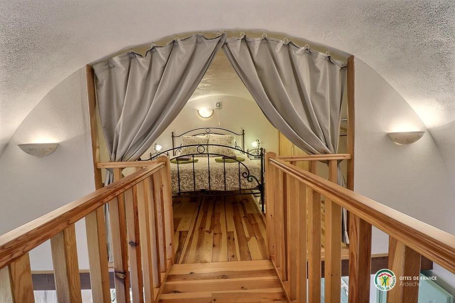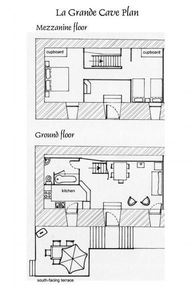 Chaque appartement/gîte dispose de sa propre terrasse, orientée plein sud, ce qui permet de savourer ses repas à la manière de la France méridionale. Une grande piscine est à la disposition des hôtes de la Rastelayre mais rien n’empêche de se baigner et même de nager dans la rivière. De nombreux endroits ensoleillés ou ombragés permettent de se détendre ou de pique-niquer en famille. Avec une surface au sol de 65m², 'La Grande Cave' est un logement confortable pour 4 personnes (6 est possible). Elle a deux chambres en mezzanine, une avec un lit double (160cm x 200cm), l’autre avec deux lits simples (90cm x 200cm). Le séjour inclus un canapé-lit pour deux personnes (140cm x 200cm). La cuisine américaine est bien équipée et la salle des bains a un bain et une douche. La terrasse est équipée avec des meubles de jardin, un parasol et un barbecue. Le jardin, la rivière, la piscine, les terrasses sur la rivière et la piscine, le jeu de boules, les hamacs etc. sont à la disposition de nos hôtes.