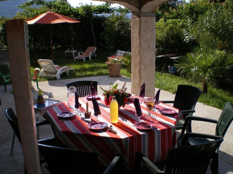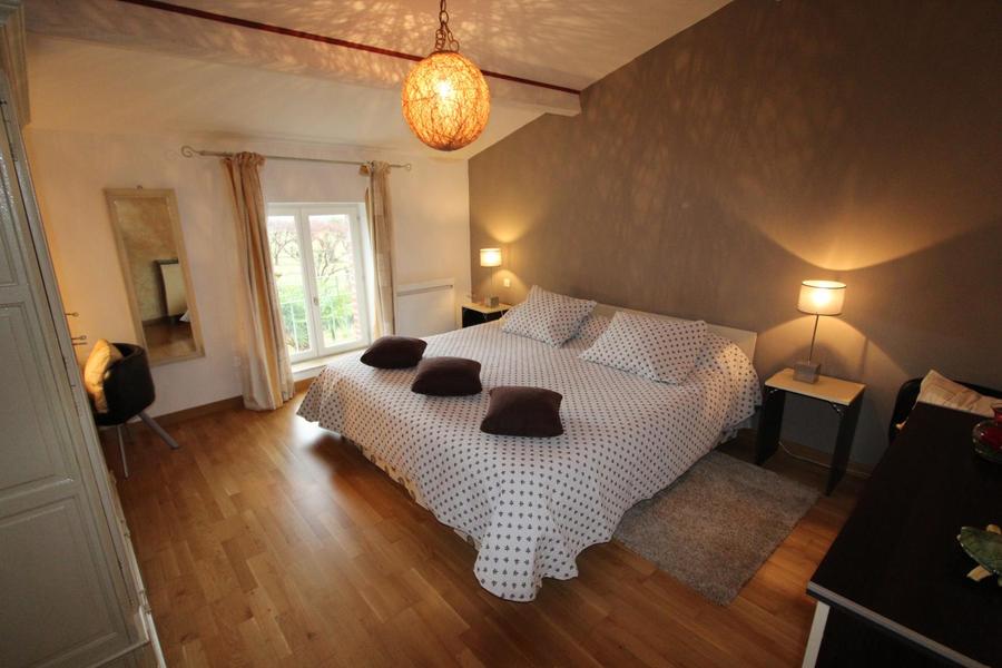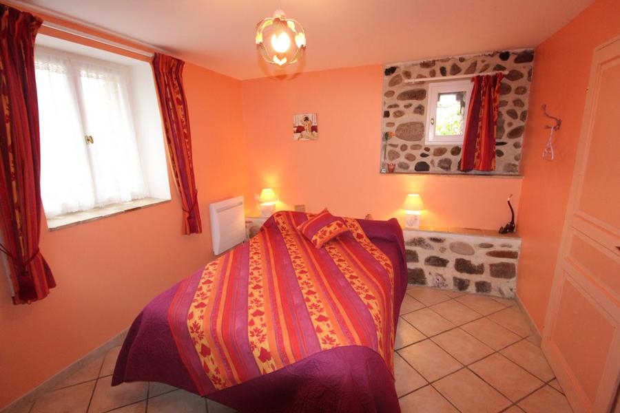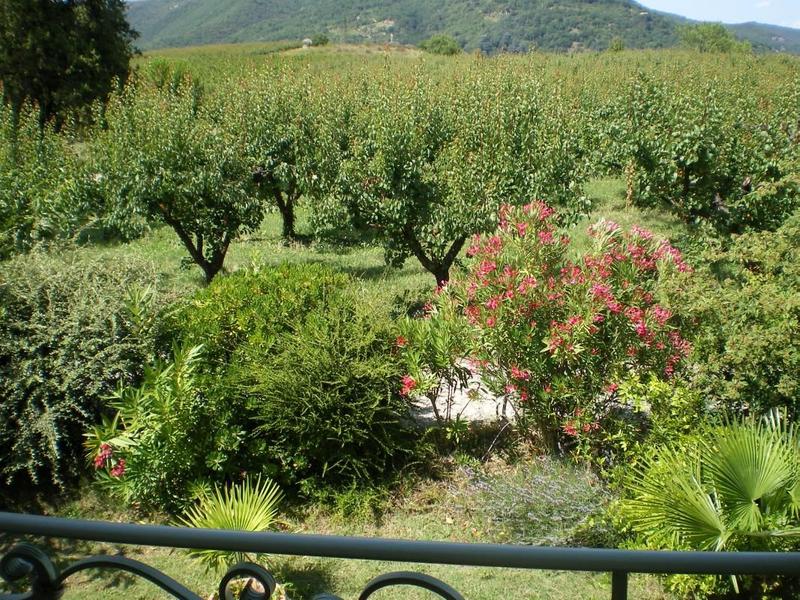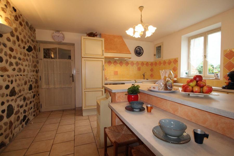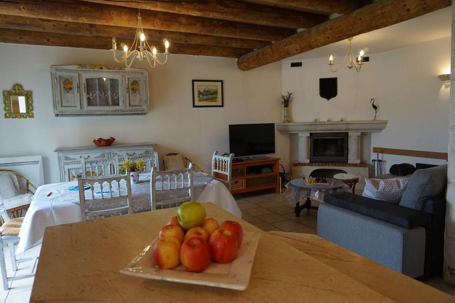 Terrasse couverte. Séjour, c.cuisine intégré, coin salon devant la cheminée, ch1(1 lit 200*200), ch2(2 lits 1 pl), ch3(1 lit 2 pl), salle détente, salle d'eau, wc, ch.électrique. Maison chargée d'histoire depuis le 14è S. où l'ordre des Augustins habitaient ce lieu. Visite des vergers sur demande, dégustation. Parking privé. Tous services accessibles à pied au village à 1 km.