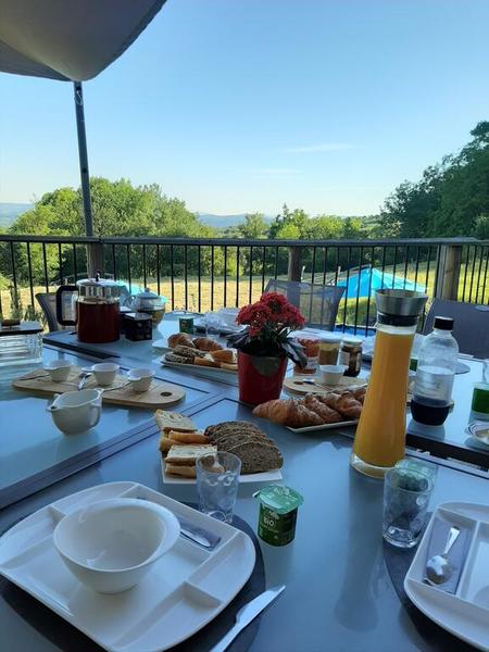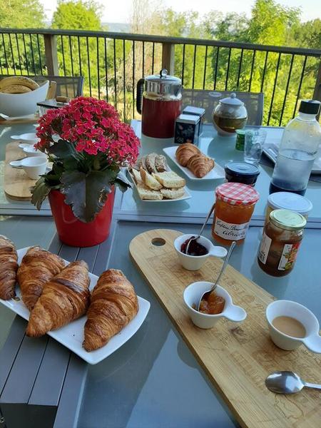Petit déjeuner en terrasse l'été. Vue sur la plaine de l'Ain. Produits locaux,bio ou faits maison. Grand choix de thés.