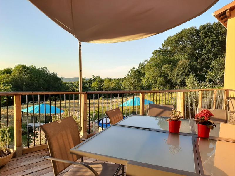 Terrasse commune des chambres d'hôtes côté piscine partagée. Vue sur la Plaine. Aucun vis à vis. Le Grand Noyer Ambronay