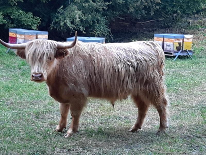 Boeuf Highland Cattle devant les ruches de l'apiculteur. Eté 2020. Petite balade du soir.