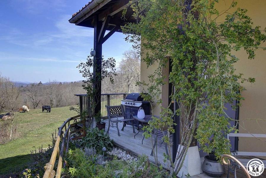 Terrasse commune avec salons de jardin, transats, barbecue gaz et vue panoramique sur la plaine de l'Ain.
