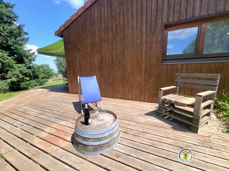 Gîte Ecorce, qualifié Ecogîte (matériaux pierres et bois, chauffage bois granulés, isolation naturelle). Terrain commun avec 2è gîte. Séjour avec c.salon, convertible 2 pers en appoint, cuisine, 1ch(1 lit 2 pl), 1ch(2 lits 1 pl), s.d'eau, wc. Le prix comprend une visite du vignoble et une dégustation de vins. Accueil 15 pers si location des 2 gîtes. Label Vignobles et Découvertes.