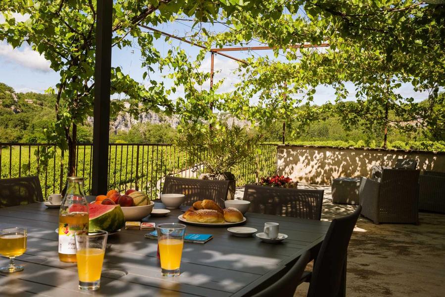 Terrasse et espace détente sous la vigne