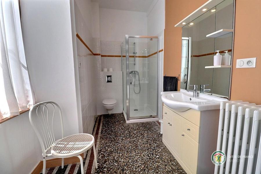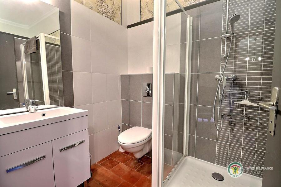 Salle d'eau privative de la chambre kaki avec douche, vasque et toilette
