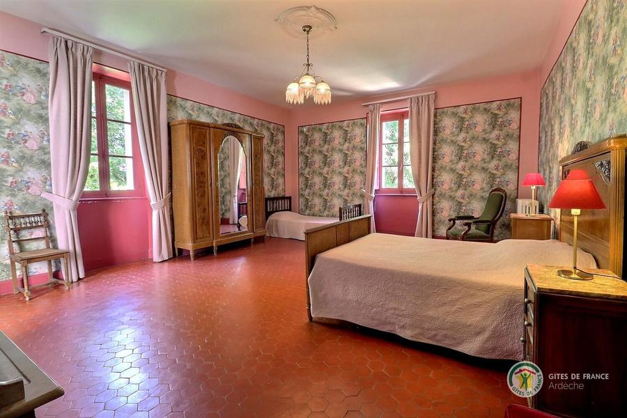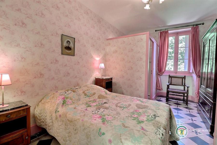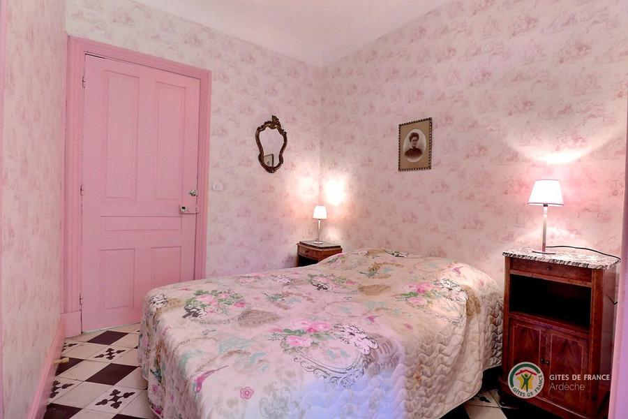 Chambre rose avec un lit en 140, armoire et salle d'eau privative