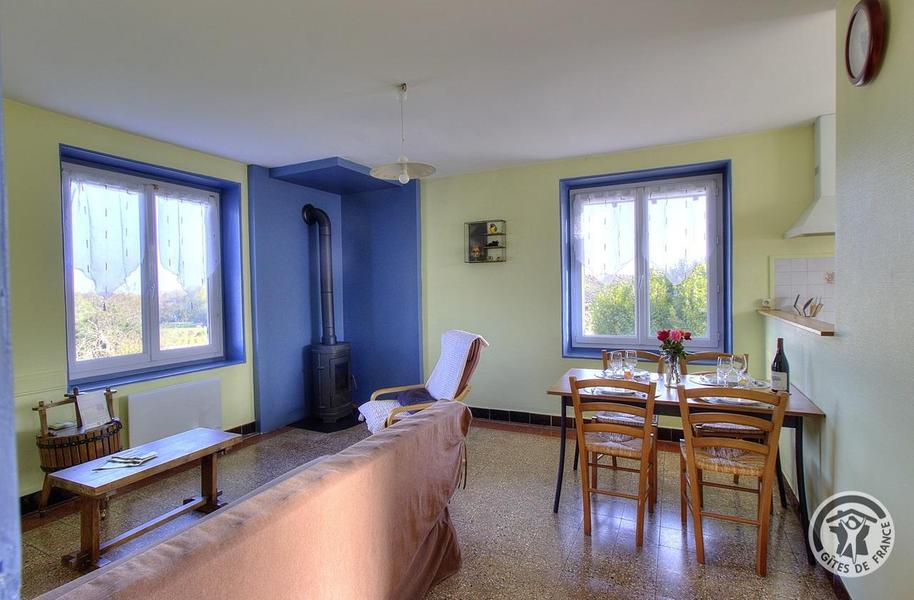 Bienvenue au Gîte "Les Marcellins" à Villié-Morgon dans le Beaujolais, chez le vigneron - RHONE : la pièce de jour composée de 2 espaces : cuisine et séjour avec coin salon.