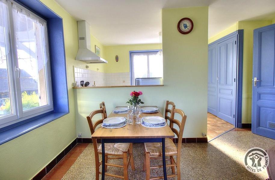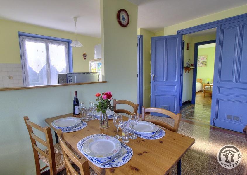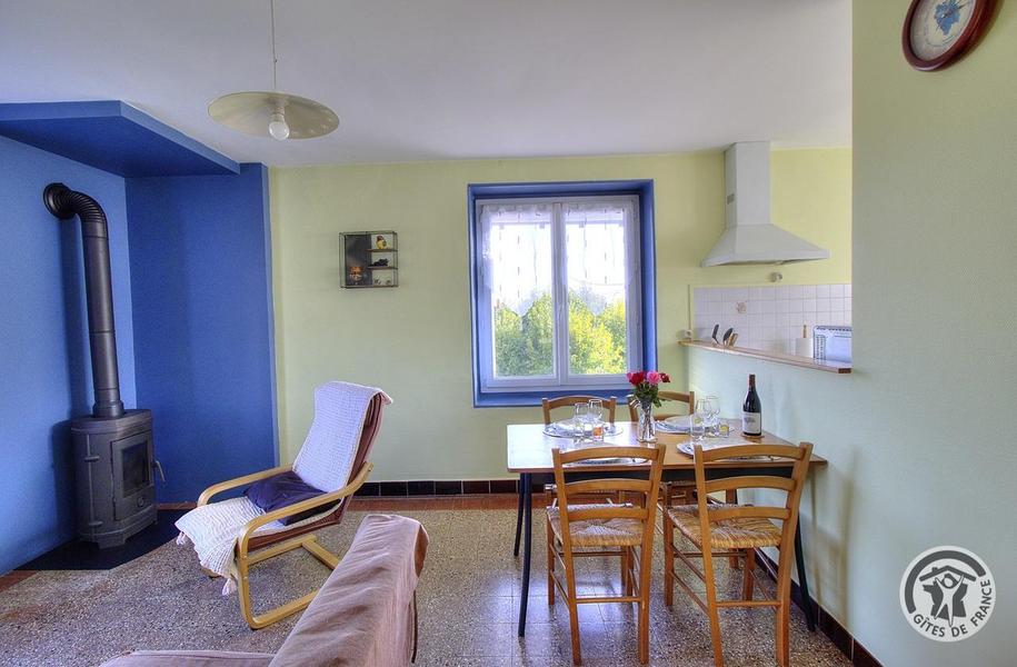 Bienvenue au Gîte "Les Marcellins" à Villié-Morgon dans le Beaujolais, chez le vigneron - RHONE : le coin repas et coin cuisine (ouvert).