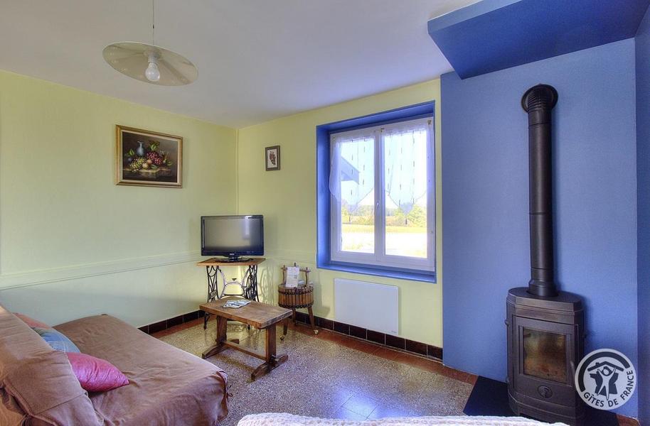 Bienvenue au Gîte "Les Marcellins" à Villié-Morgon dans le Beaujolais, chez le vigneron - RHONE : coin salon avec TV et^poêle à bois.