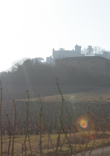 Gîte du Pré Carra - 9 personnes à MONTMELAS/ST SORLIN dans le Beaujolais - Rhône : la vue depuis la terrasse sur le château de Montmelas.