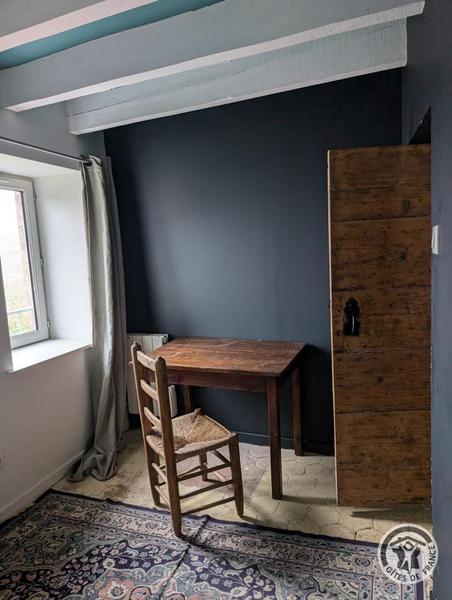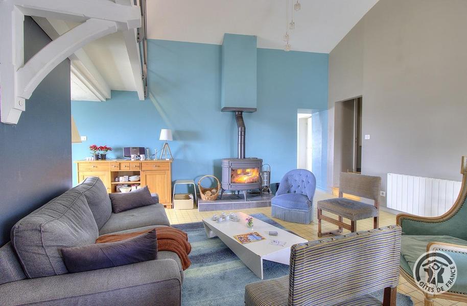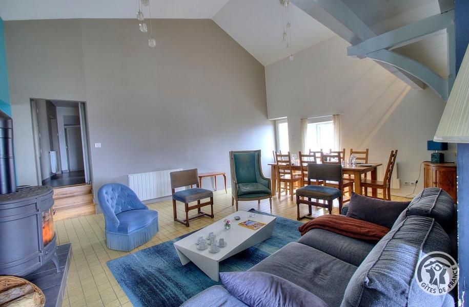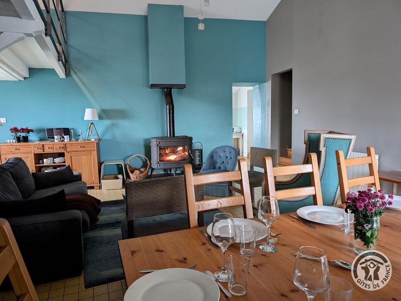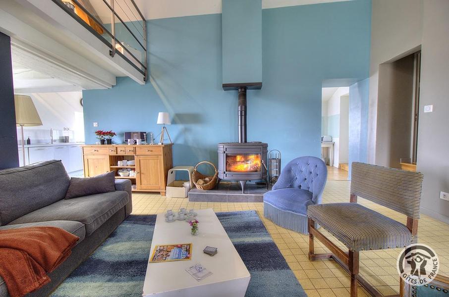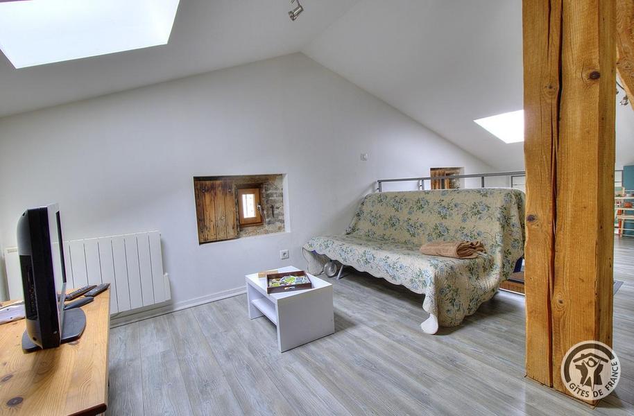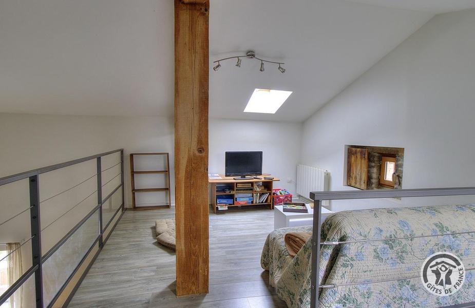 Gîte aménagé dans une ancienne ferme rénovée qui comporte un autre logement. A l'étage : grand séjour avec coin-salon (mezzanine avec TV, poêle à bois), 1 chambre (canapé BZ 2 pers.), cuisine ouverte moderne et toute équipée (m-ondes, congélateur).