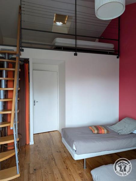 Gîte du Pré Carra - 9 personnes à MONTMELAS/ST SORLIN dans le Beaujolais - Rhône : la Chambre pour 3 personnes - escalier donnant accès à la mezzanine.