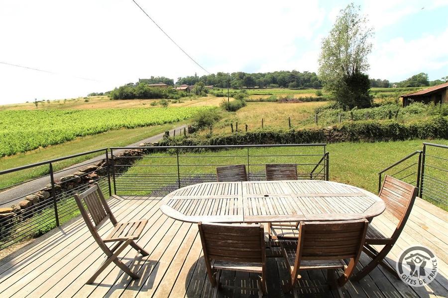 Gîte du Pré Carra - 9 personnes à MONTMELAS/ST SORLIN dans le Beaujolais - Rhône : la terrasse avec vue sur le château.