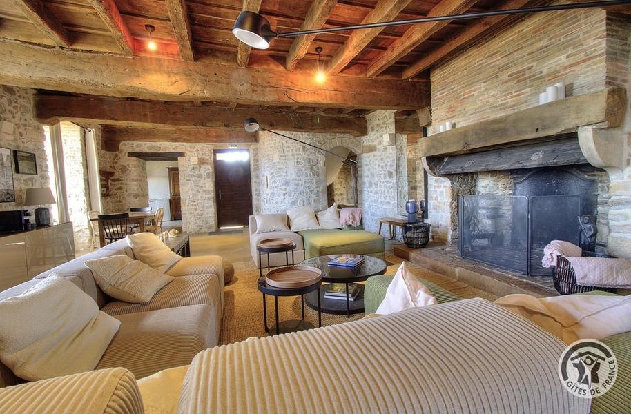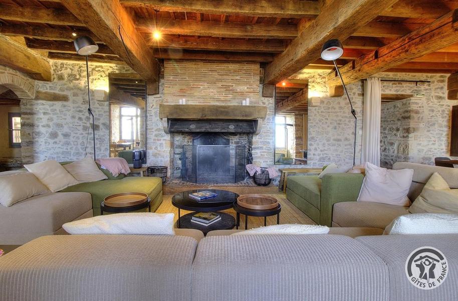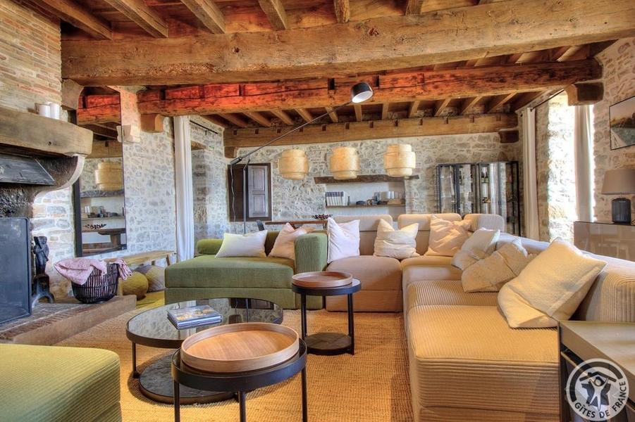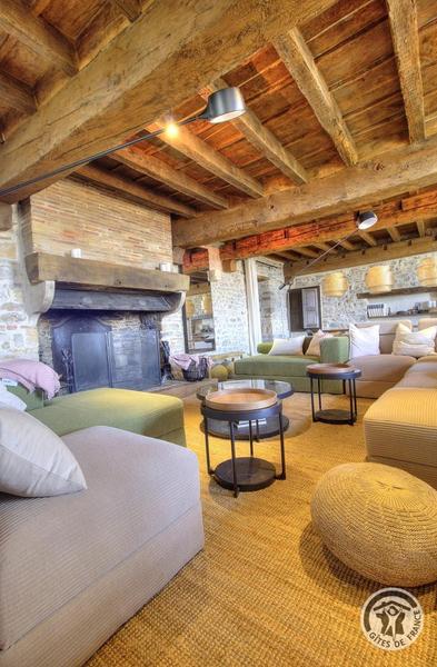 Grand Gîte "Le Vigneron" - 15 personnes - Château des Tours à St Etienne-La-Varenne dans le Beaujolais - Rhône : le coin salon avec canapés et tables basses.