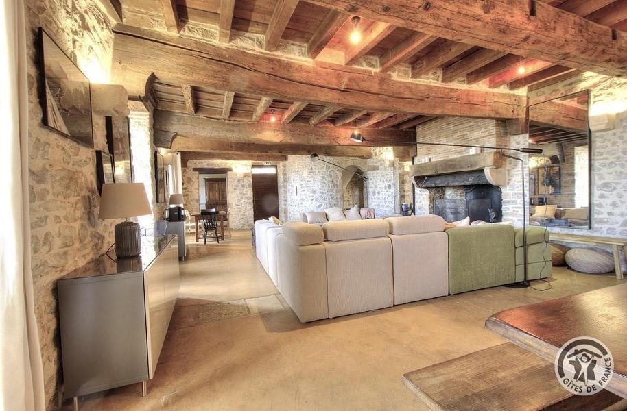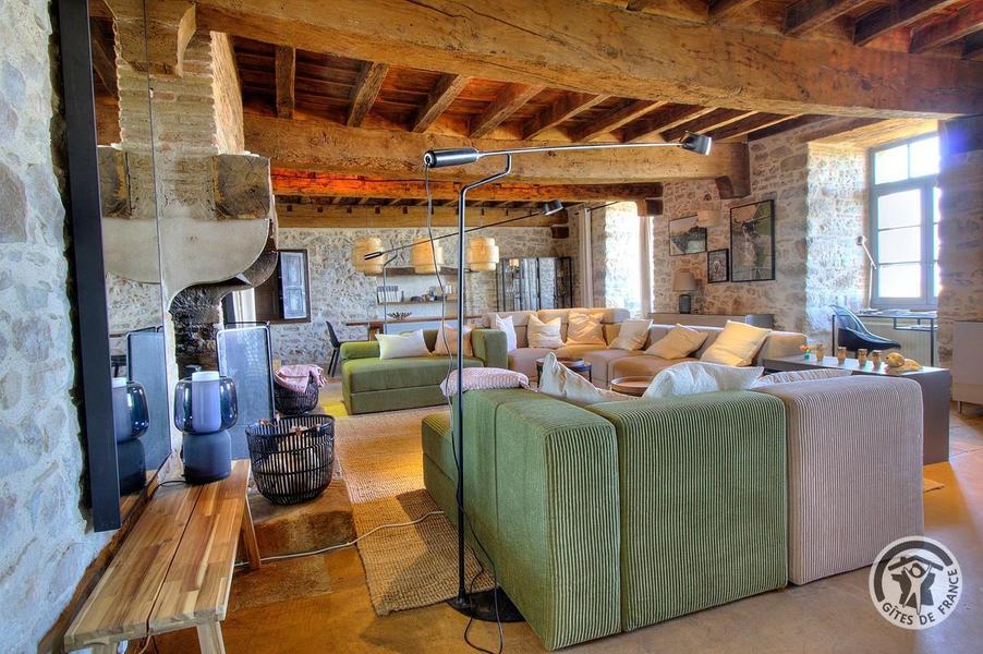 Grand Gîte "Le Vigneron" - 15 personnes - Château des Tours à St Etienne-La-Varenne dans le Beaujolais - Rhône : le coin salon dans le grand séjour.