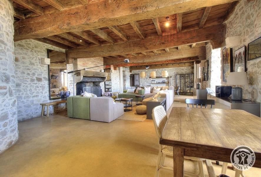 Grand Gîte "Le Vigneron" - 15 personnes - Château des Tours à St Etienne-La-Varenne dans le Beaujolais - Rhône : vue sur le séjour/salon.