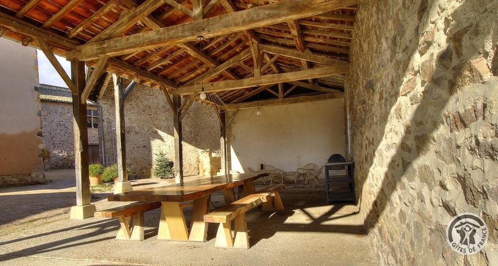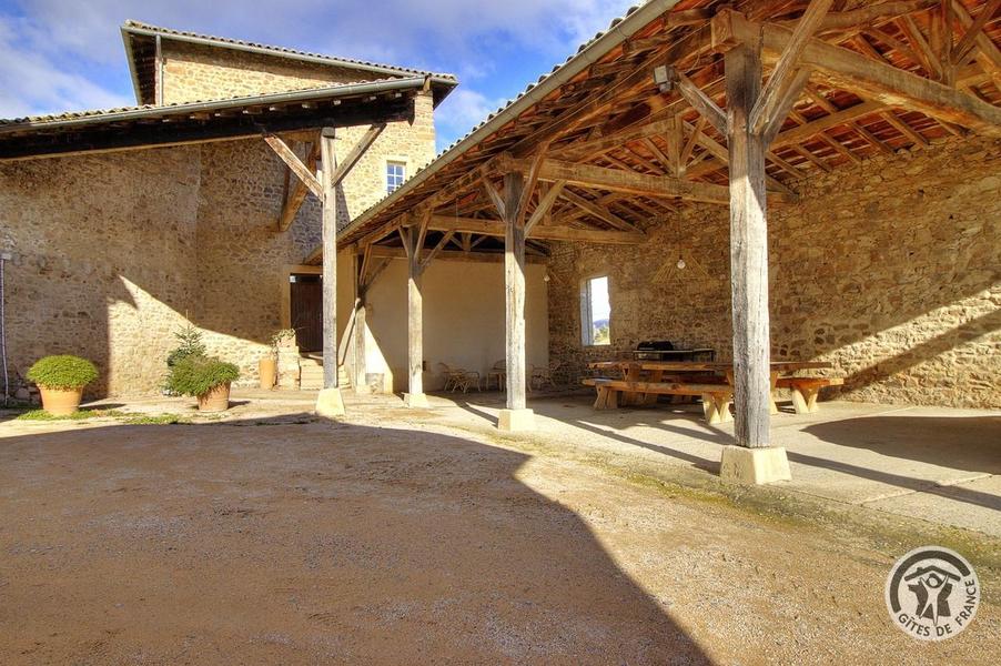 Grand Gîte "Le Vigneron" - 15 personnes - Château des Tours à St Etienne-La-Varenne dans le Beaujolais - Rhône : la terrasse couverte réservée au gîte.